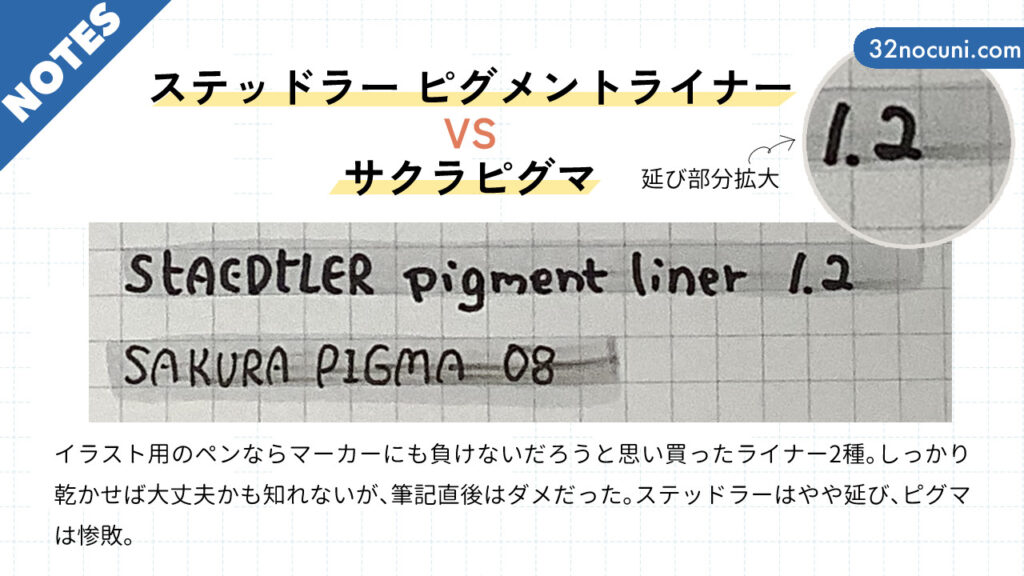 イラスト用のペンなら耐水性も高くてマーカーにも負けないだろうと思って買った、ライナー2種。結果はステッドラー ピグメントライナーはトメというか、インク溜まりの部分がマーカーで引きずられ、サクラ ピグマは延びたインクでマーカーまで黒く。