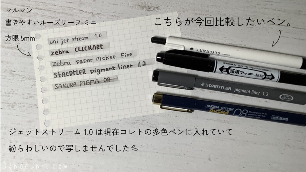 ただ、発色がやや弱いのとキャップ式なのがちょっと不満。せっかくなのでこの機に、手持ちの太めの黒ペンを比較しようと思い立ちました。