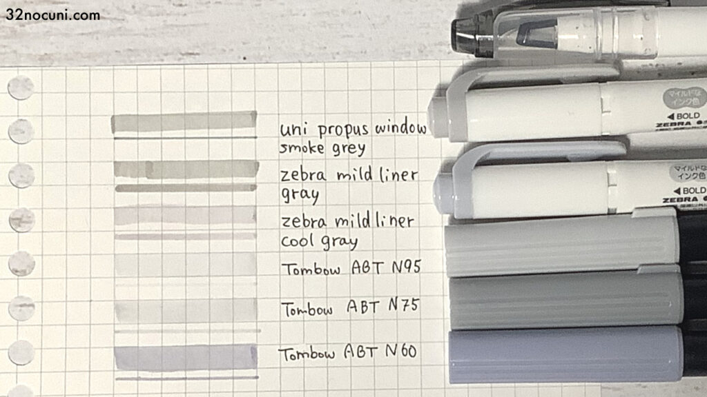 ABTのN75クールグレー3は、少しだけ文字を目立たせたいときや、淡い色で仕切り線や枠を書きたいときにぴったり。マイルドライナーやプロパスのグレーより薄くて色味にもクセがないので、今一番活躍してくれているマーカーです。