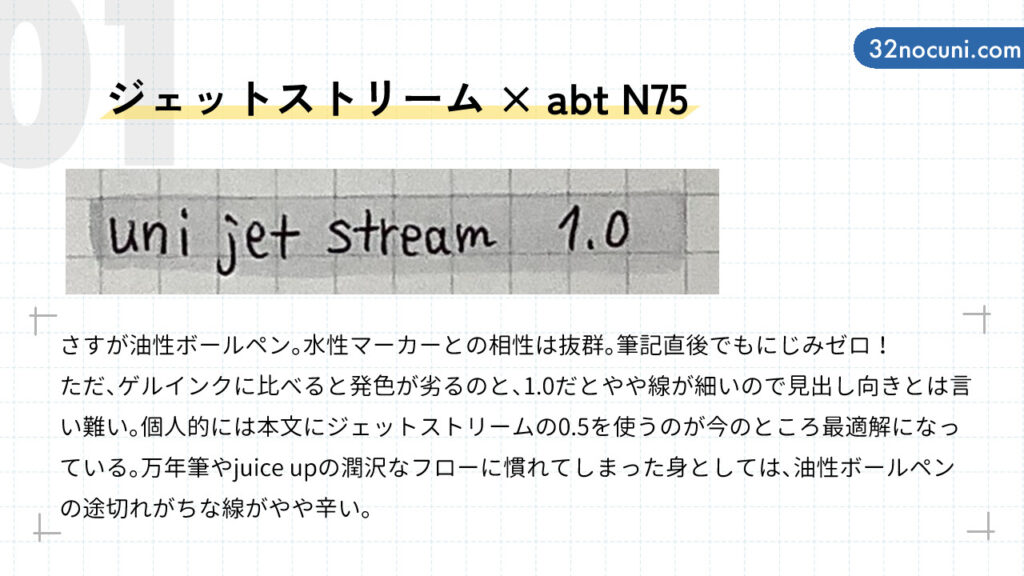 ジェットストリームは多色ペンに入れられるしマーカーとの相性抜群なのですが、発色がやや弱い。プラチナカーボンブラックやjuice upの水性顔料ゲルインクの鮮やかな発色に慣れてしまった身としては、ぼやけた黒がやや不満…。1.0という細さも見出しには少し物足りなく、出番があまりありません。