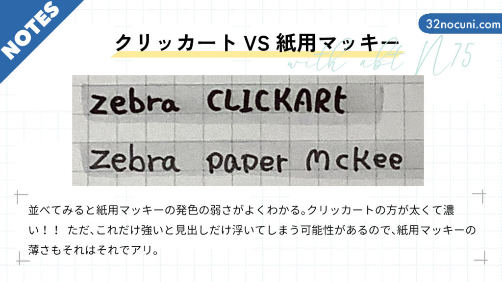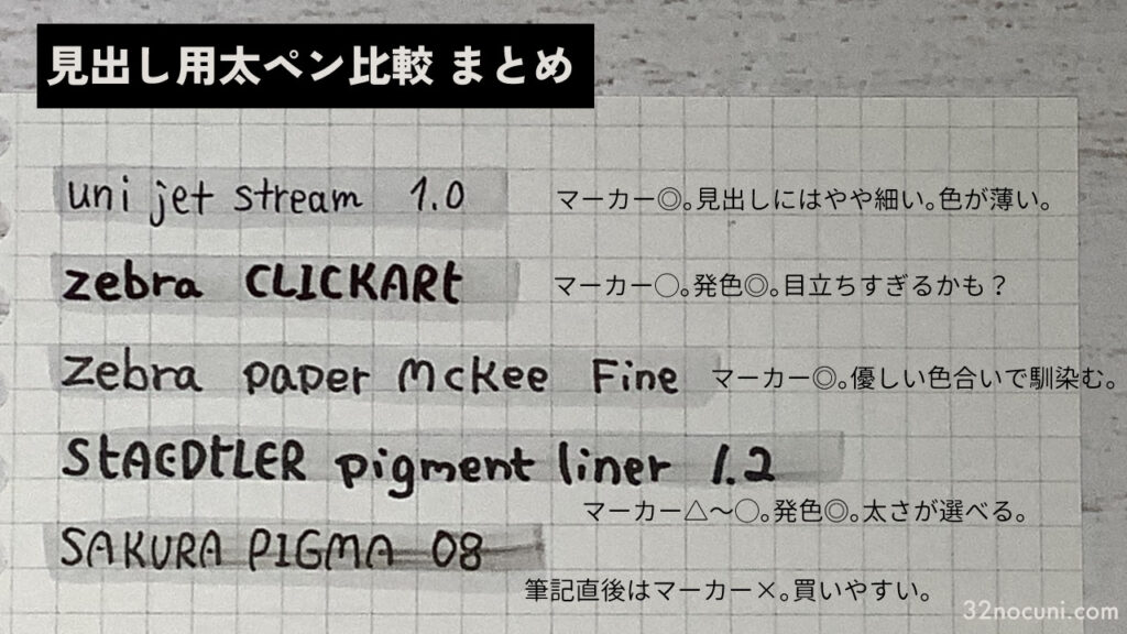 では最後に簡単にまとめていきたいと思います。ノートのタイトルや見出し用のちょっと太めの黒いペンには、私の場合紙用マッキーかクリッカートが合っていました。どちらも太さがちょうどよく、筆記直後に水性マーカーABT N75を引いても延びず優秀。