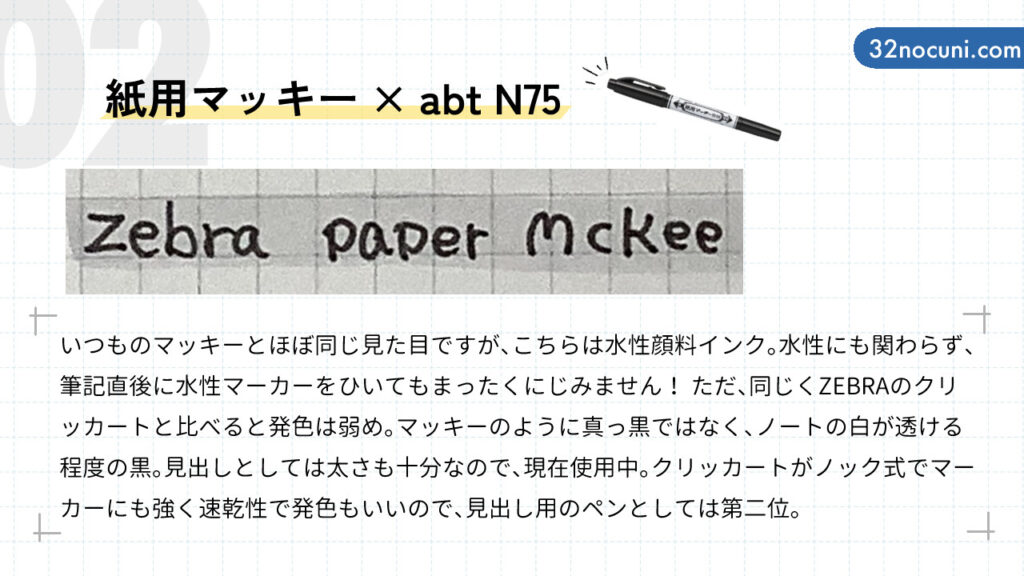 最近、見出しを太めの黒ペンで書いた上に薄いグレーのマーカーを重ねるのが気に入っていて、それに合う速乾性のペンを検証しようと思いました。上の画像で見出しの文字に使っているのは紙用マッキー(細)とABTのN75ですが、紙用マッキーは速乾性が素晴らしく、書いた直後に水性マーカー(ABT N75)を重ねても全くにじみません。