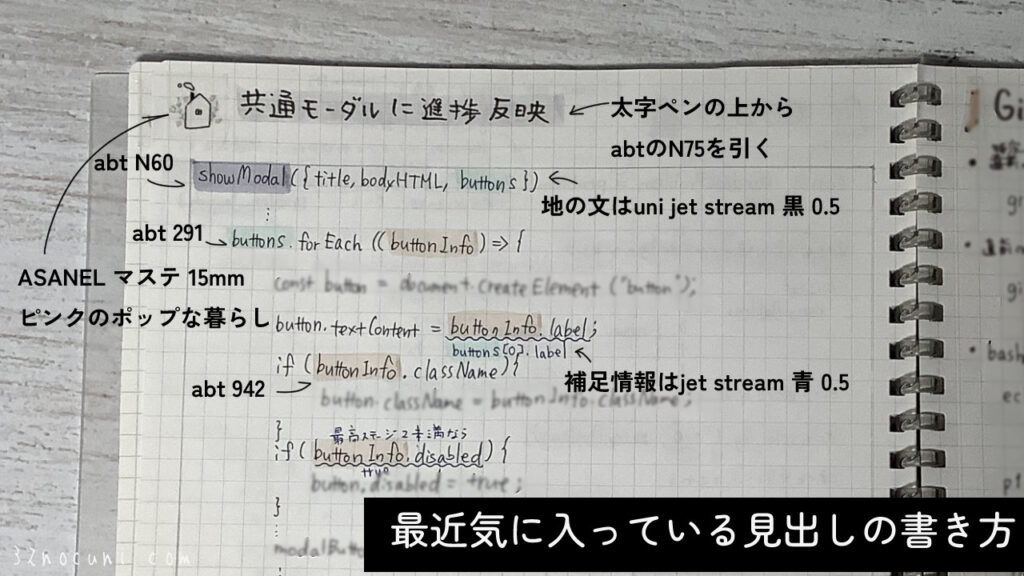 一方、0.5はノートの本文に大活躍。マーカーを多用するノートを作りたいときは、ジェットストリームの黒と青が主力のペンになっています。