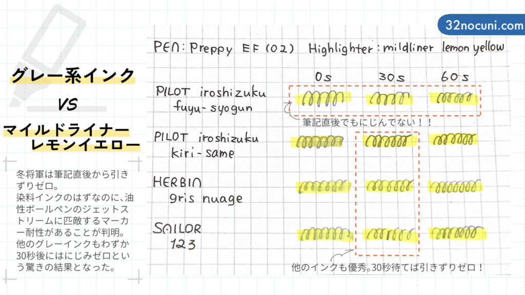今回使用した冬将軍以外のグレー系インク、色雫 霧雨、エルバン グリヌアージュ、セーラー 123も、30秒待てばマーカーのにごりはゼロ。少なくとも極細EFであれば、情報量の多いノートの作成に向くことがわかりました。
