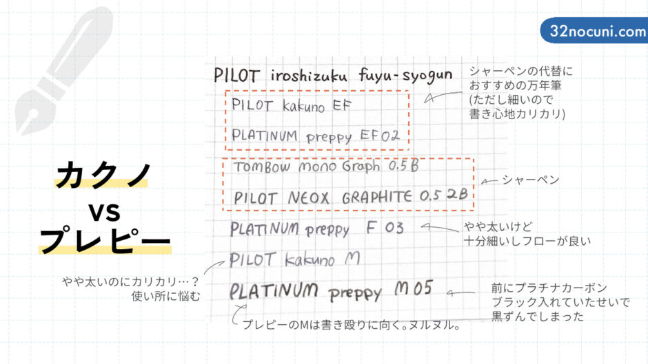 シャーペンっぽい色の万年筆インクのサンプルを書いていて、はてプレピーEF(02)はどうだったかな、と思って、せっかくなのでカクノとプレピーとシャーペンを比較してみることにしました。