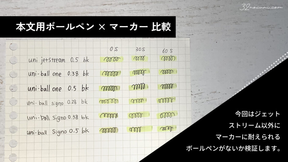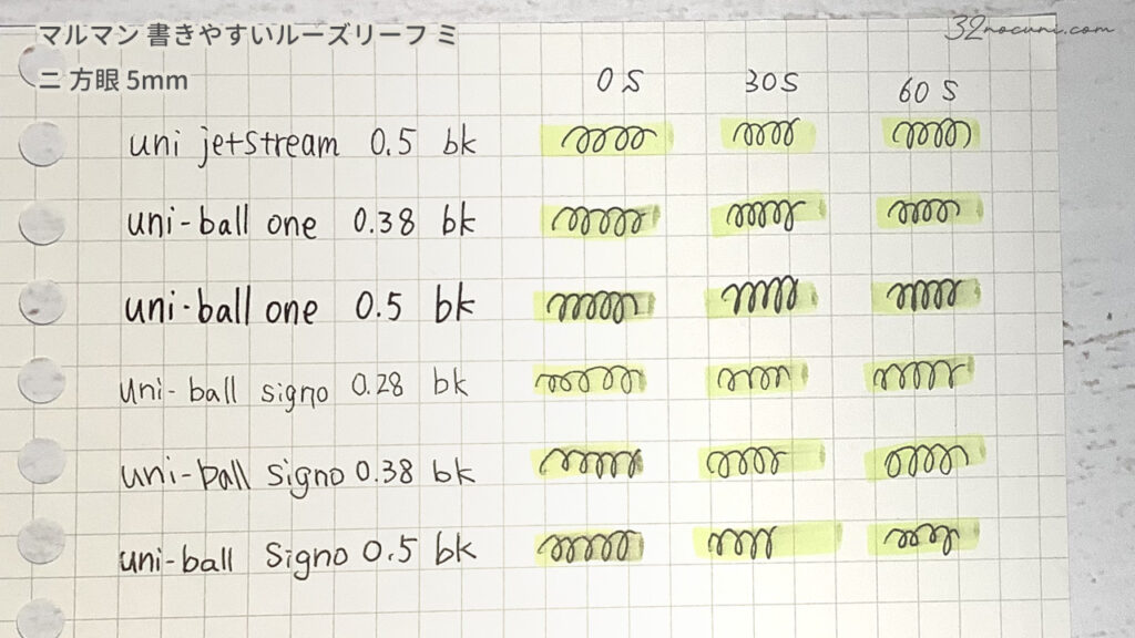 それぞれ、筆記直後、30秒後、60秒後にボールペンの上からマーカーを引きました。紙はマルマン 書きやすいルーズリーフ ミニ 方眼罫5mmを使用しています。