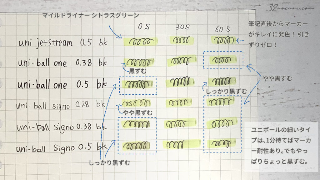 肝心のマーカー耐性ですが、マーカーを微塵も黒ずませないジェットストリームと比較してしまうと結果はイマイチ。ですが、0.28や0.38の細さに限って言えば、1分以上待ってからマーカーを引けば少し黒ずむ程度で済むことが分かりました。