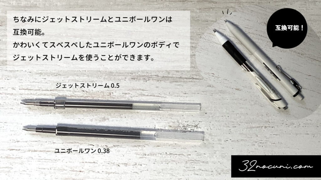 ちなみに、ユニボールワンとジェットストリームのインクは互換可能でした。リフィルを見るとユニボールワンのほうがインク量が多く太いのですが、問題なくジェットストリームのリフィルをユニボールワンに装着することができます。